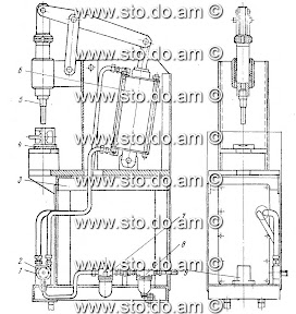 Стенд предназначен для сборки и разборки распределительного вала с шестерней, а также для выпрессовки кольца из поршня и втулки из верхней головки шатуна автомобиля ЗИЛ-130 На раме 3 стенда (рис.) шарнирно крепится пневмоцилиндр 6, кран управления 2 с педалью 1, маслораспределитель 7, влагоотделитель 8 и упор 9. Для выпрессовки кольца из поршня его кладут на подставку 4 и выпрессовывают палец оправкой 5. Для снятия шестерни с распределительного вала ее устанавливают на подставку так, что распределительный вал своим концом опирается на упор 9. Тип----------------------------------------------------------стационарный Привод ----------------------------------------------------пневматический Давление воздуха в пневмосети. кгс/см----------26,3 Расход воздуха, м3/ч-----------------------------------0,5 Управление ----------------------------------------------педальное Габаритные размеры, мм-----------------------------805X510X1670 Масса, кг--------------------------------------------------360